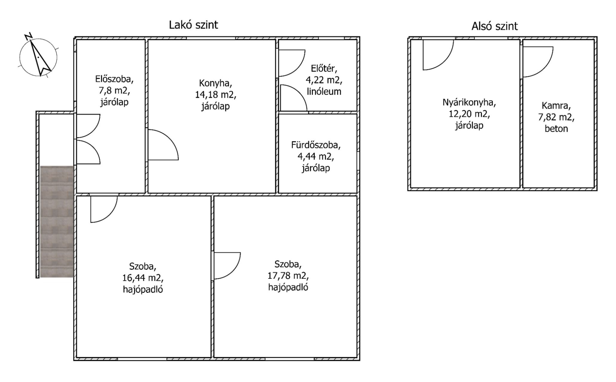 A felső szinten, előszoba, két nagy lakószoba, konyha, fürdőszoba van, az alsó szinten nyári konyha, és egy nagy tároló helyiség található, valamint egy kisebb melléképület.
