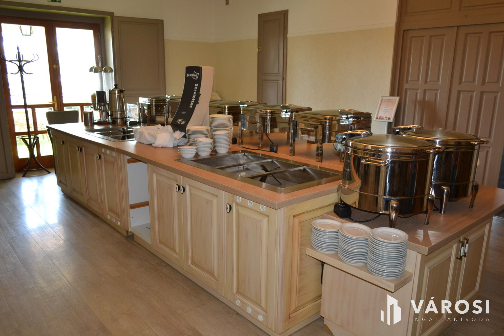 - Konyhája, és kiszolgáló helyiségei teljes berendezéssel: hűtőkamrákkal, gépekkel, edényekkel, és bútorzattal együtt eladók.