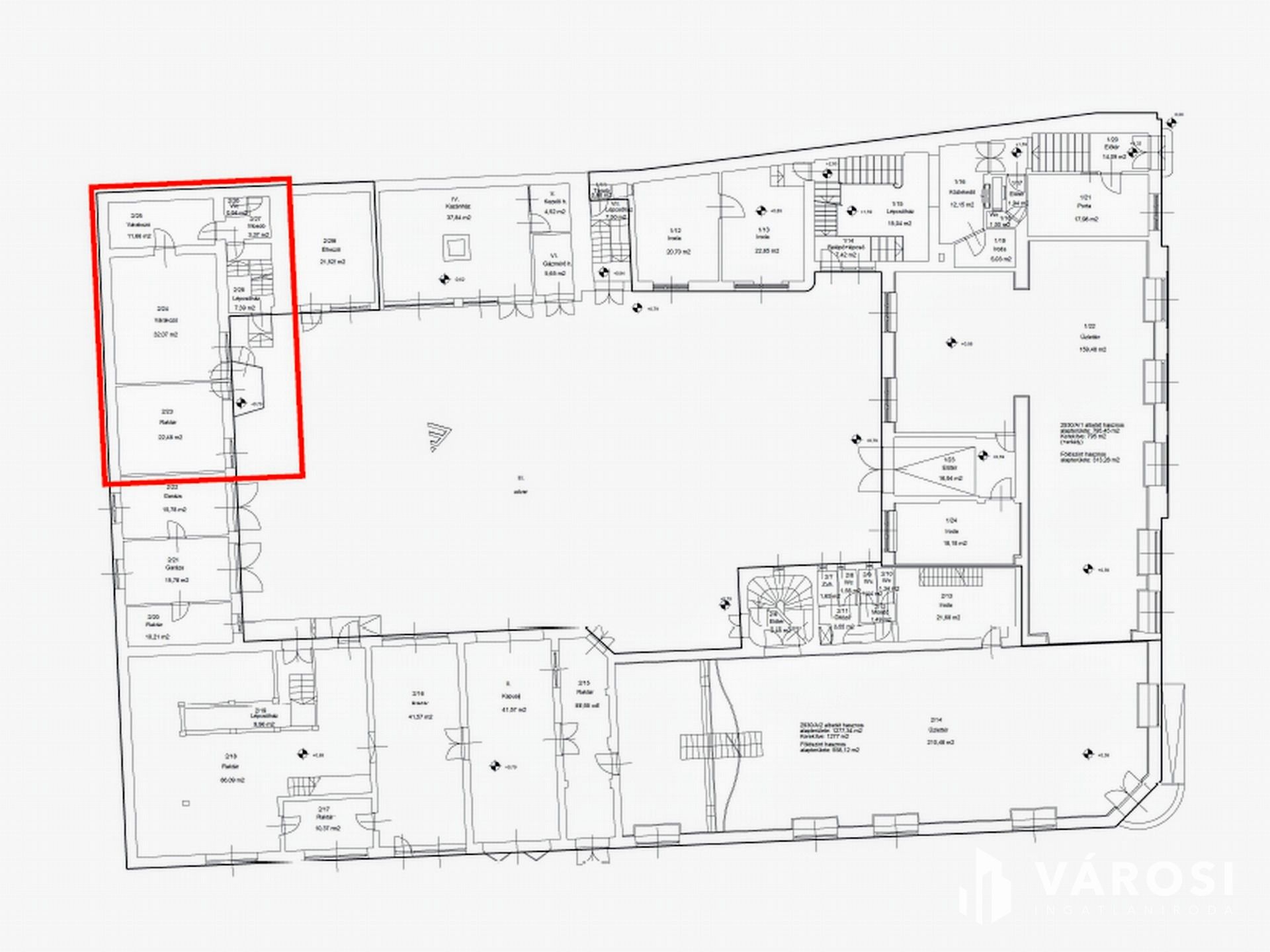 Társasházi alapító okirattal, 2 HRSZ-szel rendelkezik, a tulajdoni lapon irodaépületként szerepel.