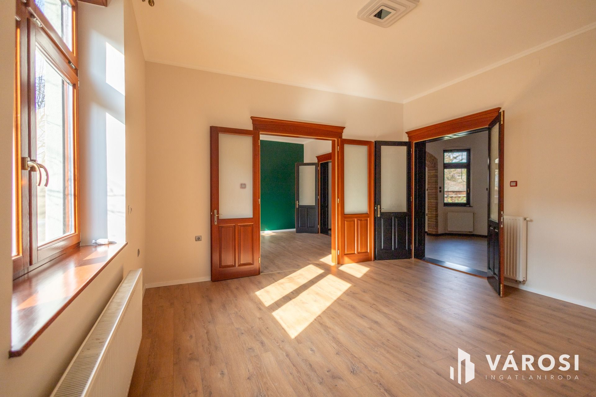 A teljeskörűen felújított, impozáns polgári ház 3 tágas szobával és konyhával rendelkezik. A gyönyörű belső terek prémium anyaghasználattal készültek, minden részletében a minőséget tükrözik. Az egyik, üvegportálos szoba, amelyhez egy fedett terasz kapcsolódik, különleges hangulatot áraszt, padlófűtéssel biztosítva a maximális komfortot. A fűtés központi rendszerű, radiátorokkal megoldva. Elektromos redőnyök, klímák és kiépített videokaputelefon rendszer növelik a kényelmet és a biztonságot.
