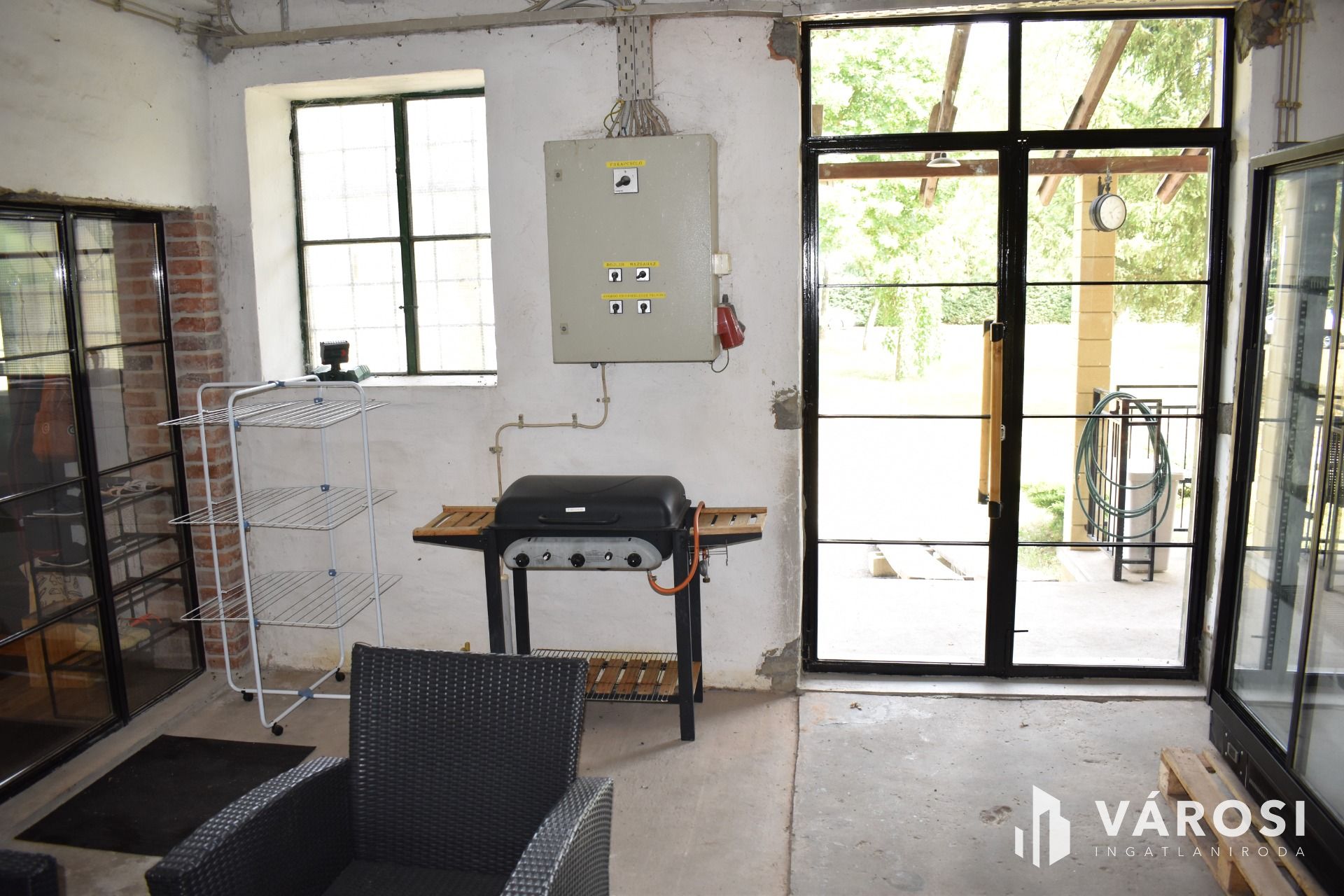 Néhai rakodó-rámpa, a hozzá tartozó tetővel átépítésre került, így hangulatos fedett terasszá vált (tűzifa tárolóval).