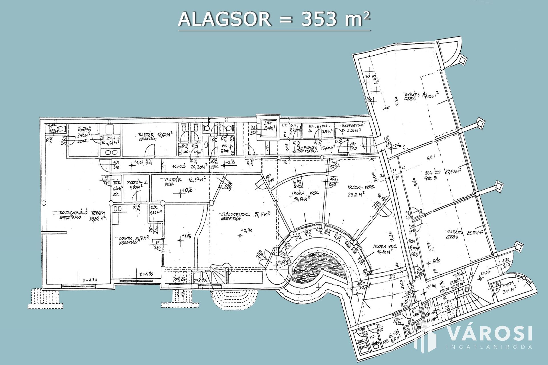 ALAGSOR - 353 m²: Garázsok, porta, előcsarnok, 3 iroda, konyha, konditerem, öltöző, 2 fürdő, 6 mosdó, raktárak és kiszolgáló helyiségek