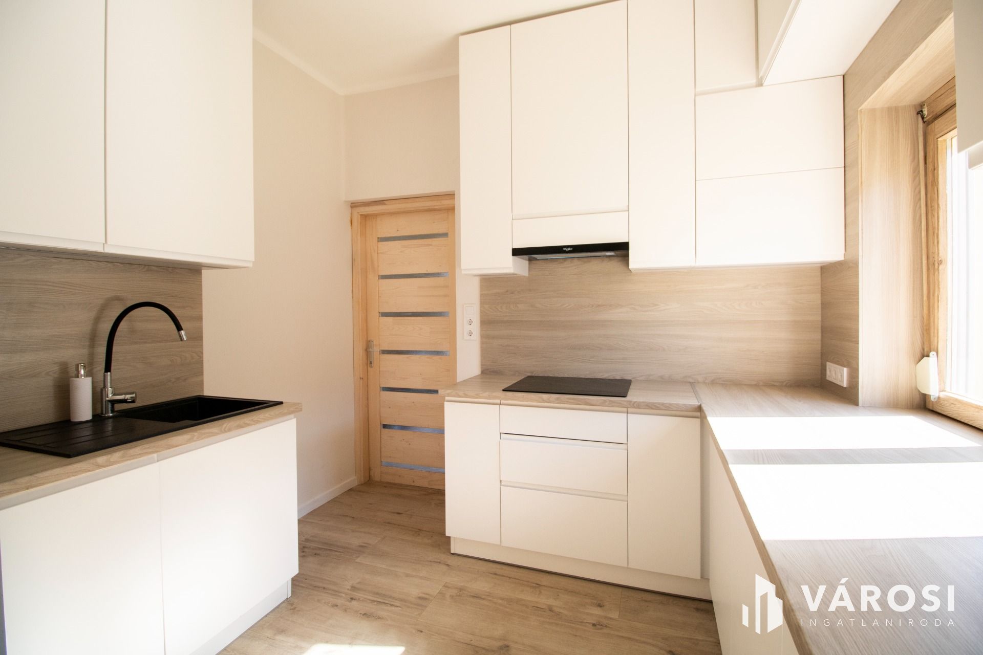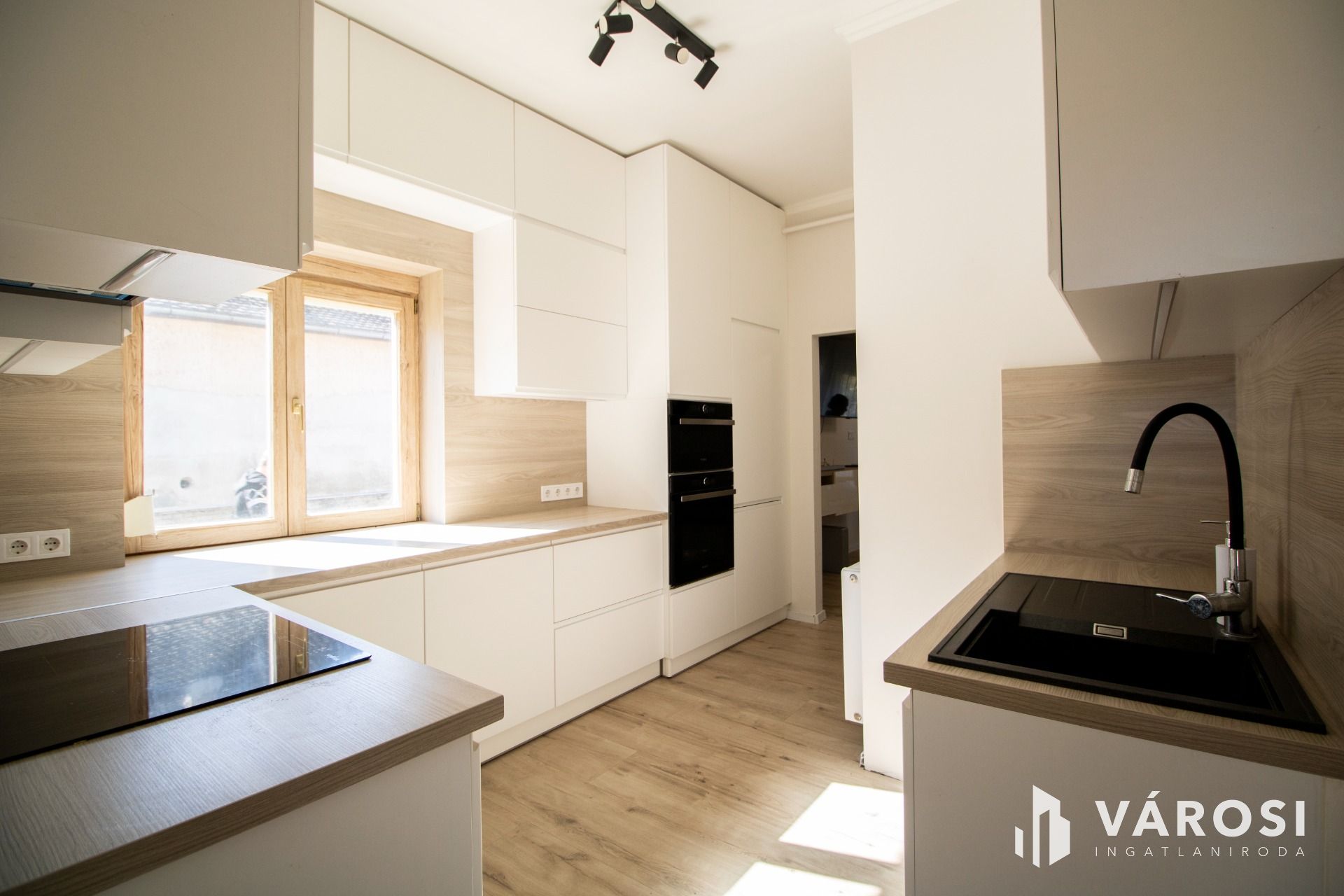 A konyha az ingatlan egyik kiemelkedő pontja, hiszen magasfényű fehér konyhabútor került beépítésre mennyezetig kialakított tárolókkal és teljes gépesítéssel. Az elektromos főzőlap, a sütő, a gránit mosogató, a beépített hűtőszekrény és a mosogatógép mind a konyha részét képezik.