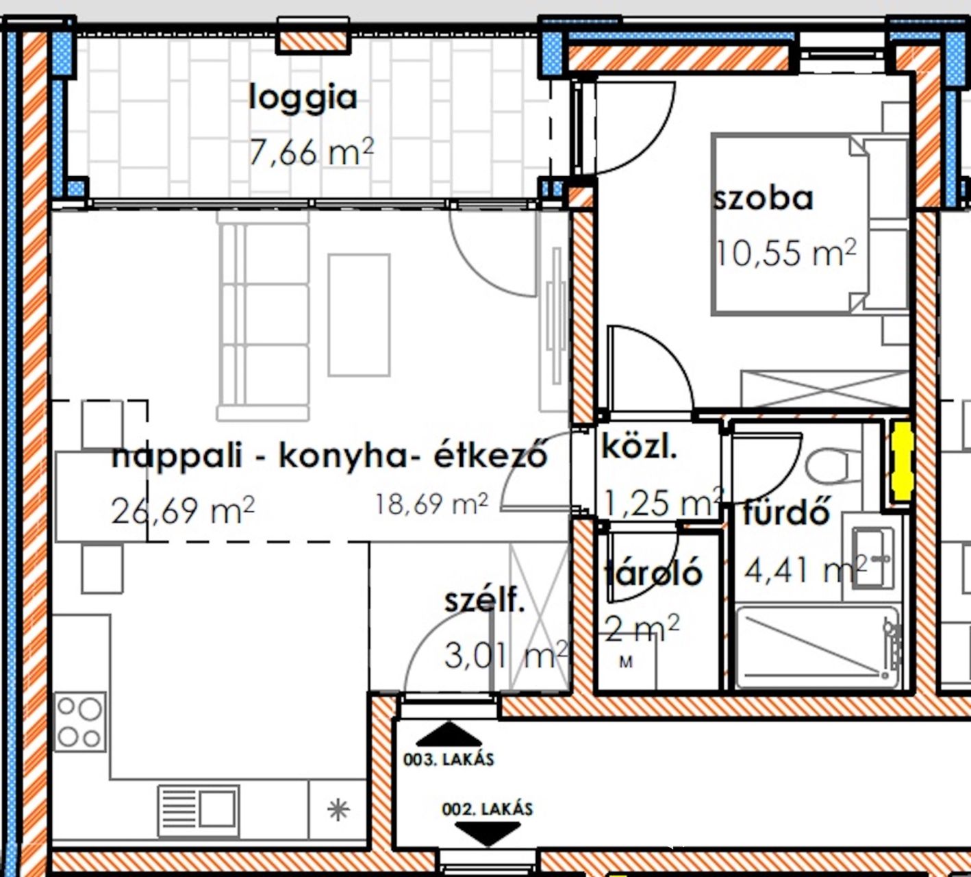 A 1 db amerikai konyhás nappalival, 1db hálószobával, 1 db fürdőszobával, közlekedővel, loggiával rendelkezik.