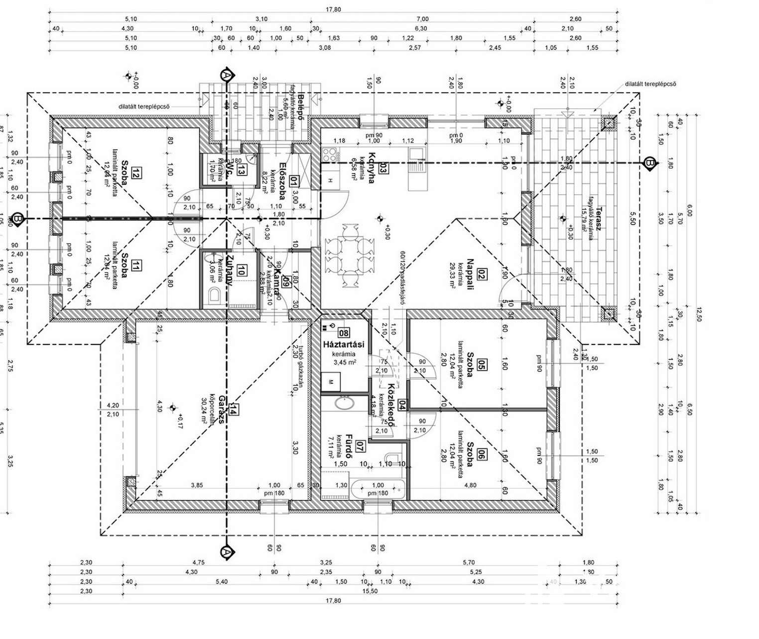 - szeglemezes, rácsos szerkezetű szerelt födém 30 cm hőszigeteléssel