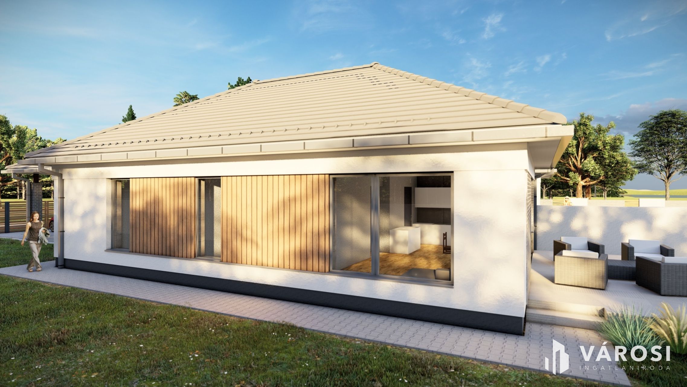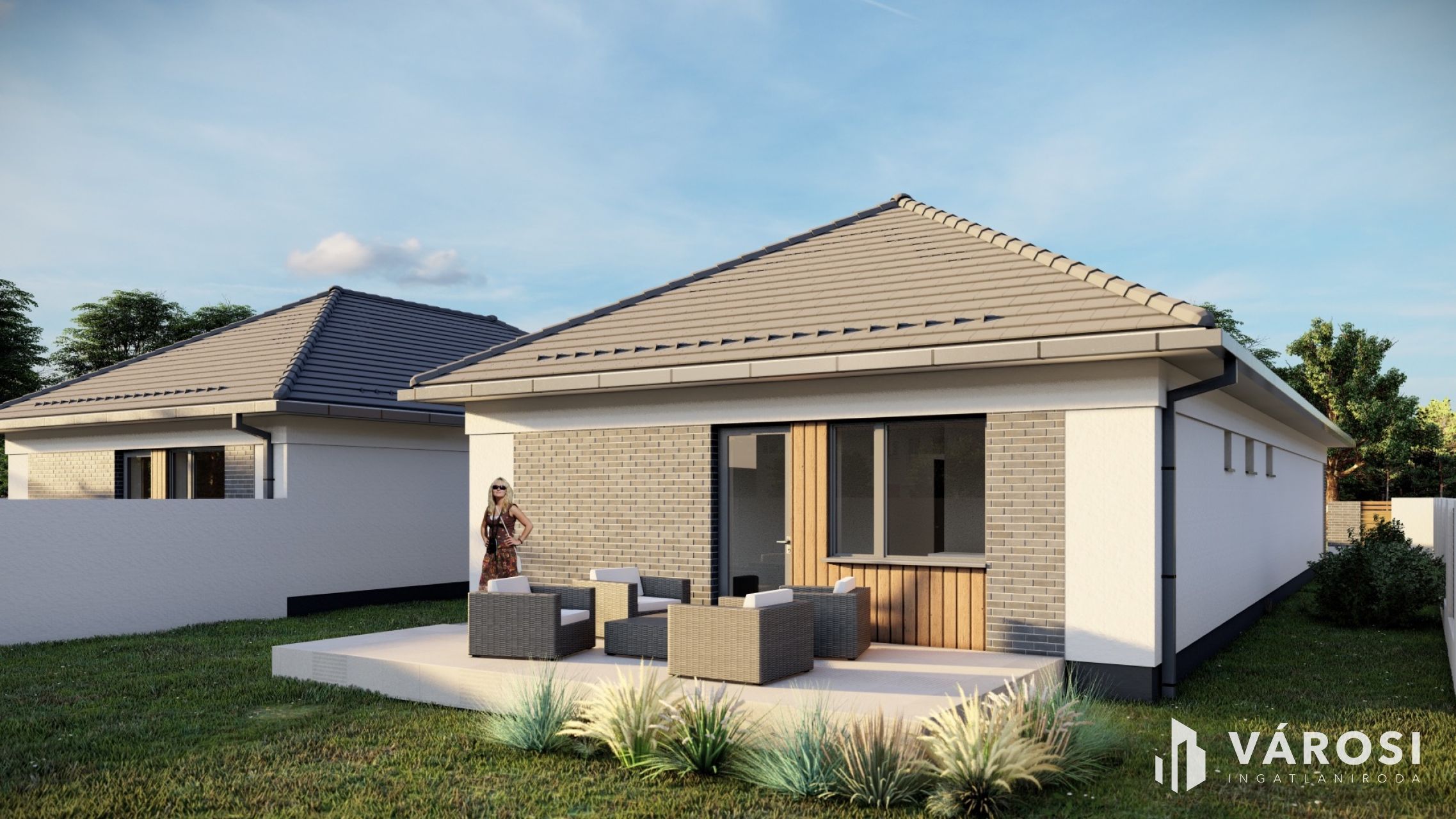 A házban tágas amerikai konyhás nappali + 3 kényelmes szoba, gardrób, valamint külön fürdő és WC kap helyet.